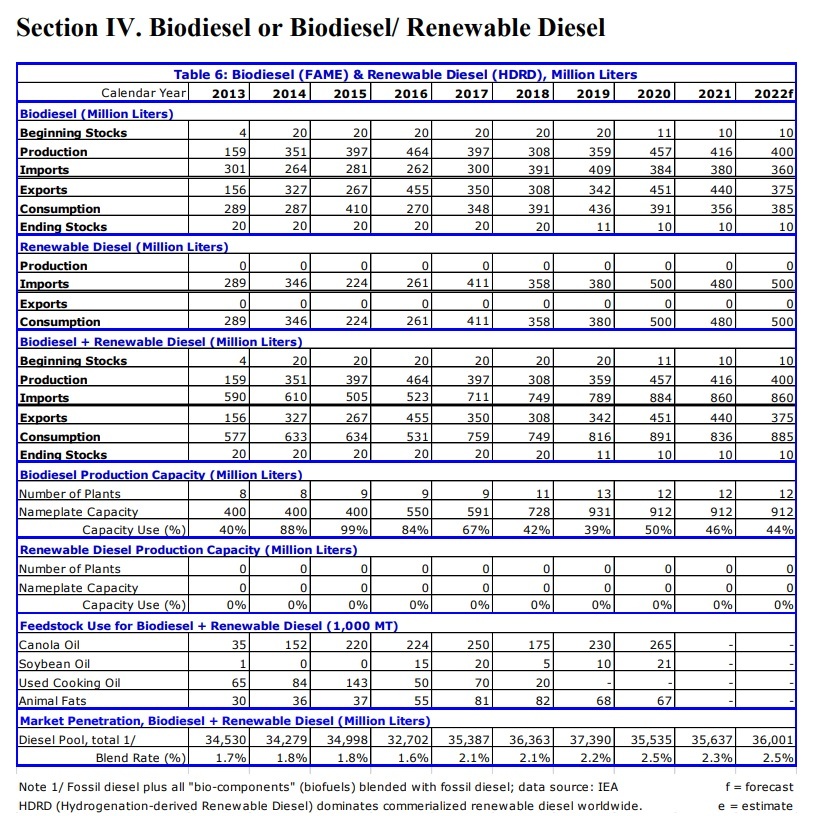 Canadian consumption of both renewable diesel and biodiesel is expected to be up slightly in 2022, according to a report filed with the USDA Foreign Agricultural Service’s Global Agricultural Information Network.